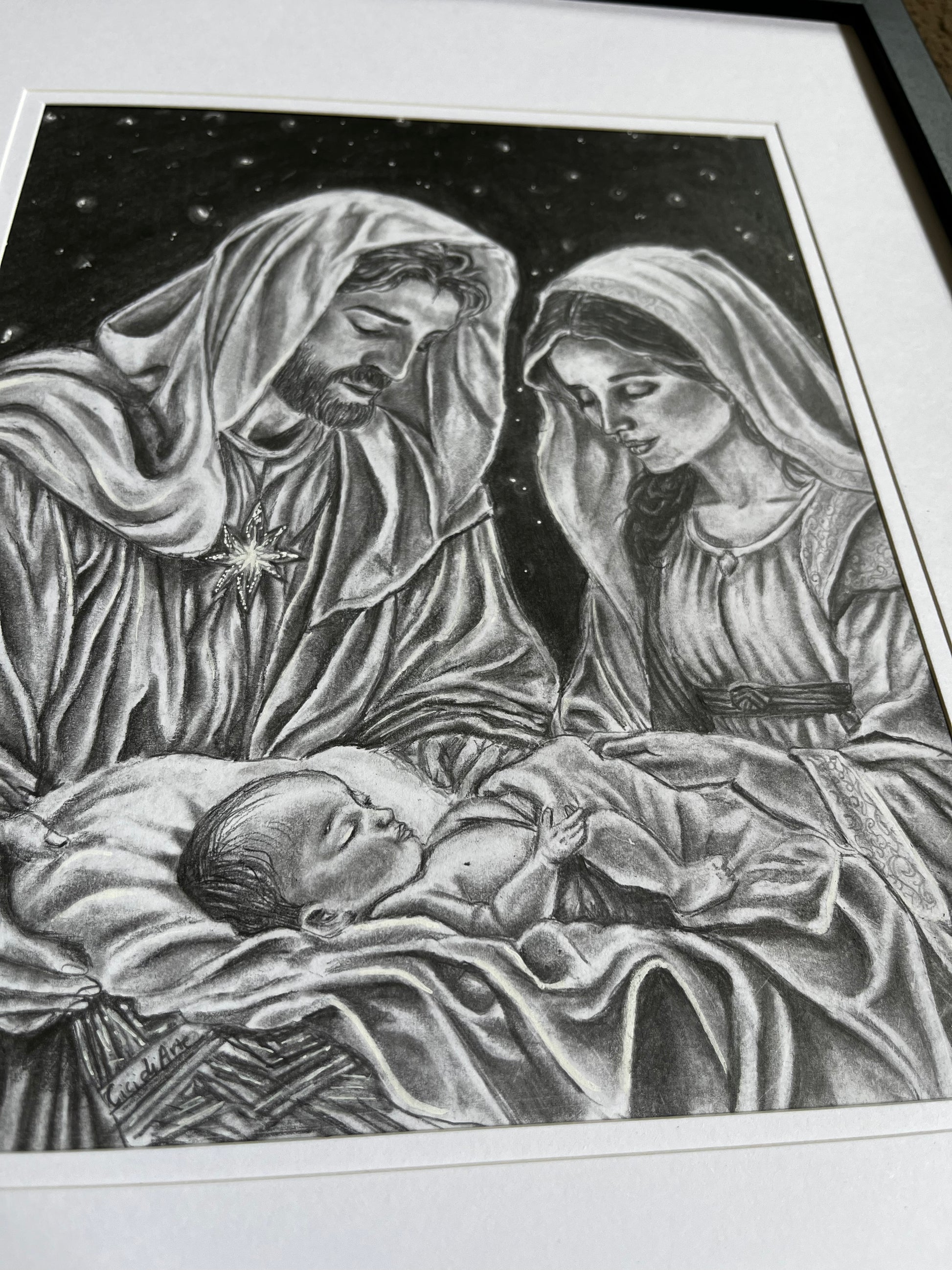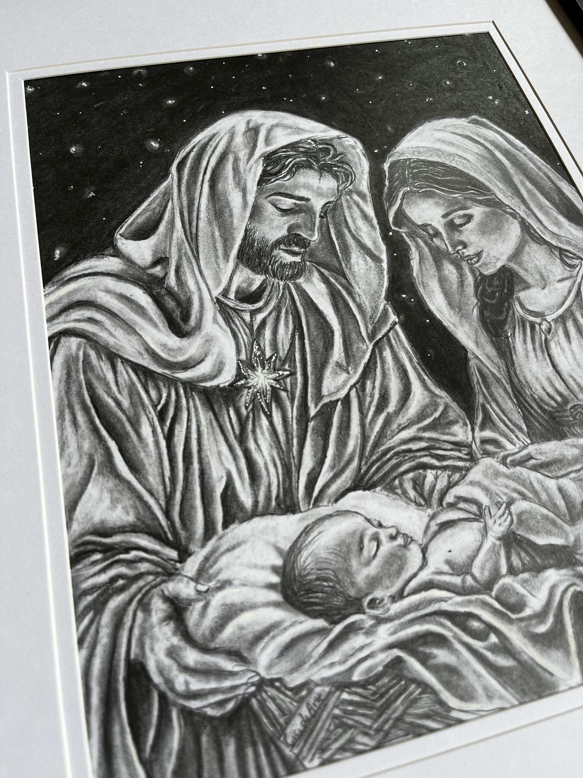 Our beautiful, highly detailed hand-drawn portrait of the Holy Family—Jesus, Joseph, and Mary—is the perfect piece to celebrate this Christmas. Carefully crafted in black and white with graphite pencil, it captures the warmth, love, and devotion of the Nativity, making it a meaningful addition to your holiday décor. Professionally framed and ready to display, this artwork brings a timeless and elegant presence to any home, and makes a thoughtful gift that will be cherished for years to come. Celebrate the spirit of the season with a piece that embodies faith, family, and the true meaning of Christmas.